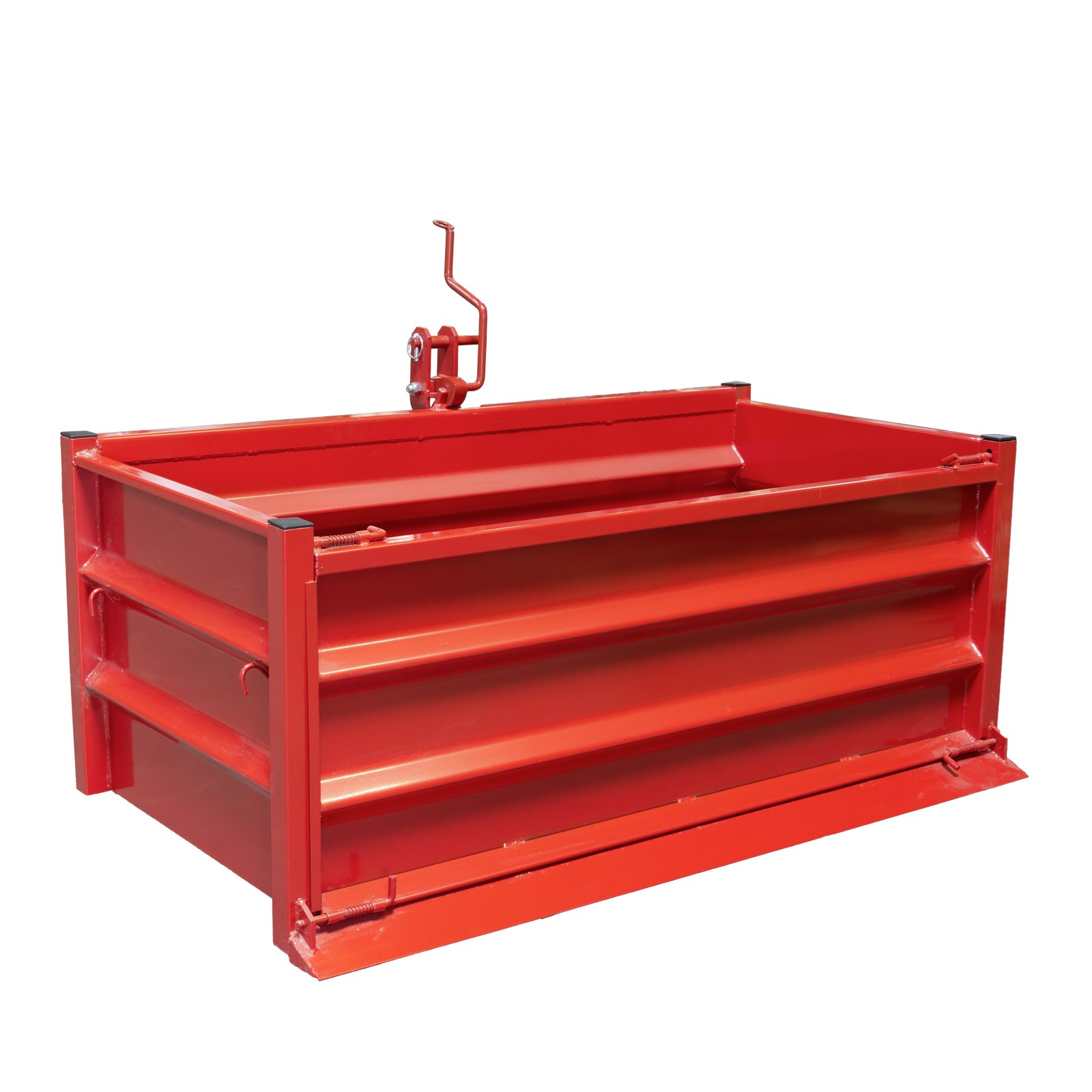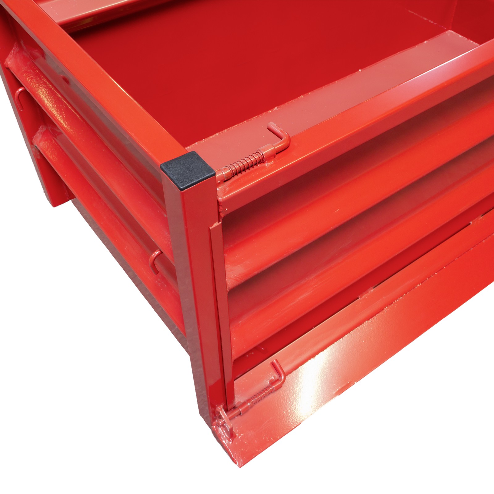 Der Stabilo Heckcontainer ist komplett aus Stahl gefertigt, mit robustem 4-Kant-Stahlrohr-Rahmen, rot lackiert.
